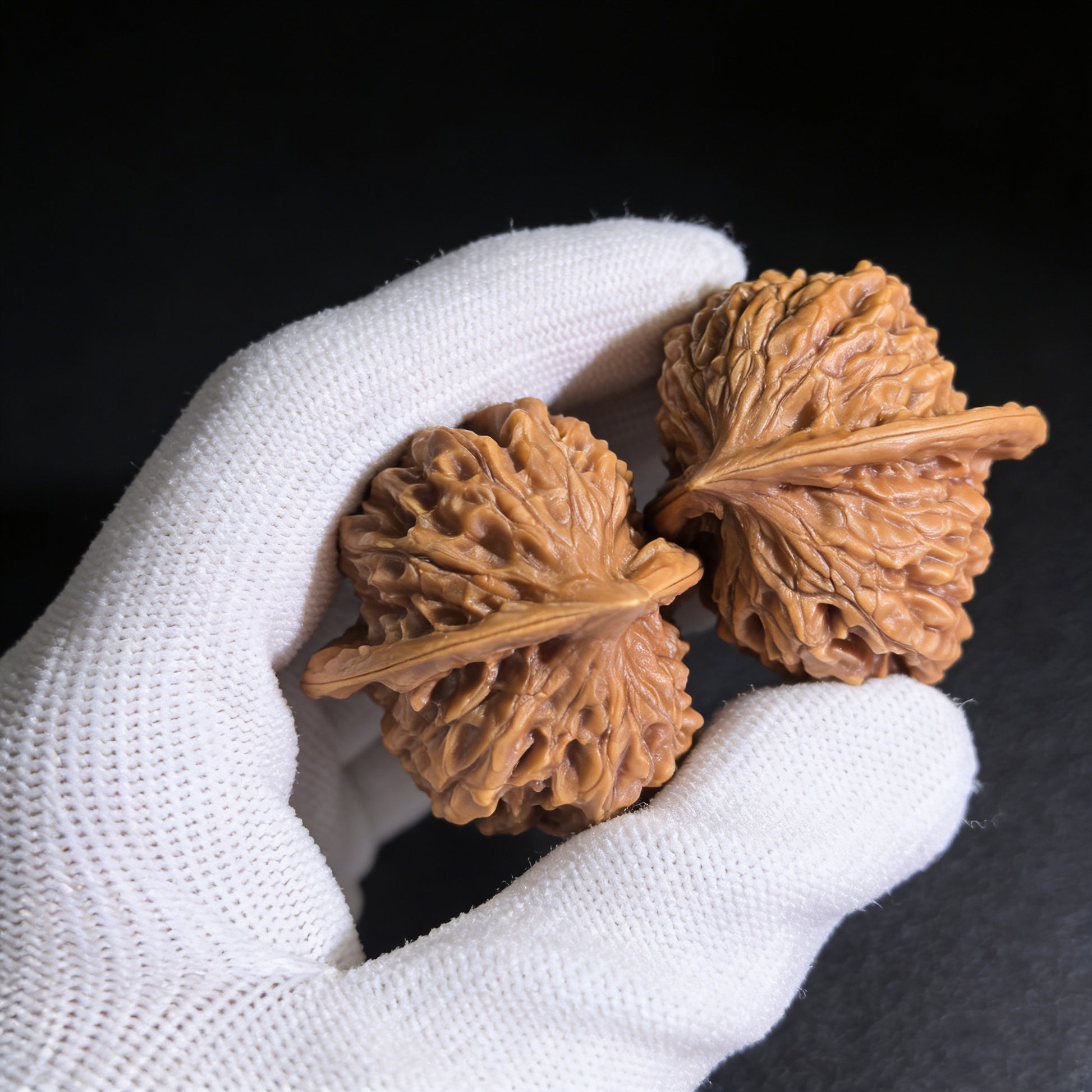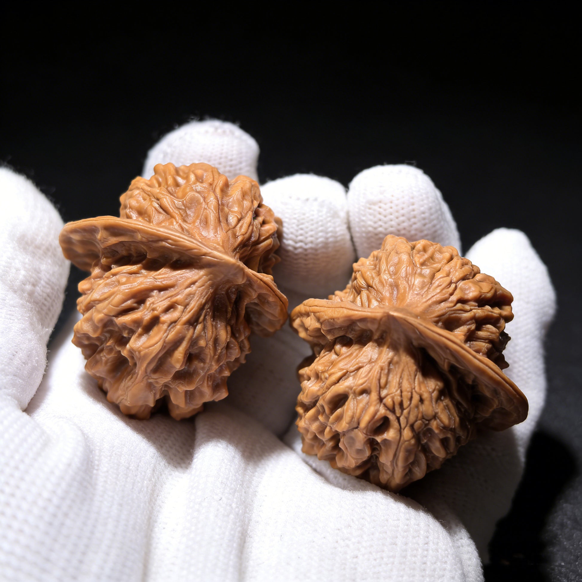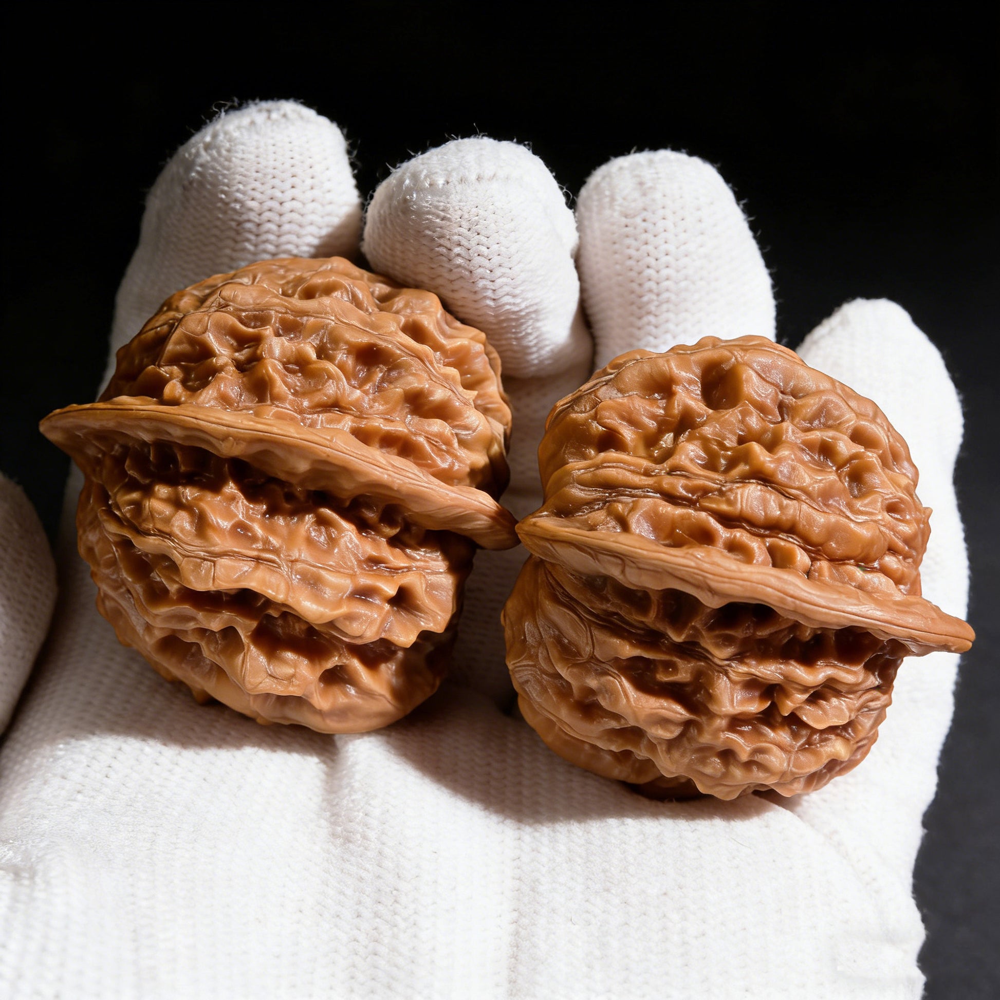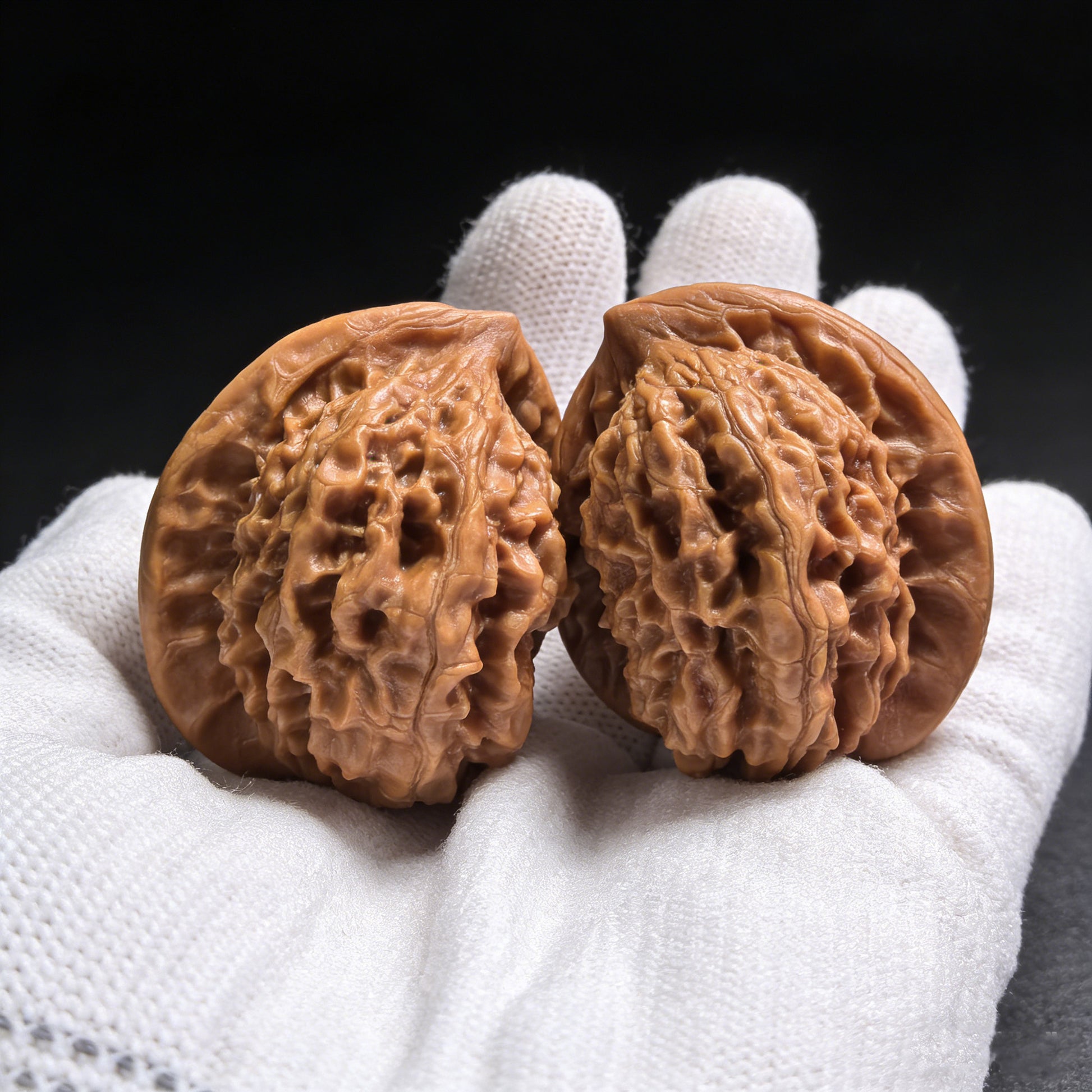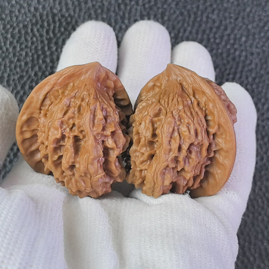 This intense natural compression creates the "Ban Bi" (Half-Wall)—a perfectly flat side on each walnut. When you place their flat sides together, they flawlessly unite to form a single, complete shape. Furthermore, the "Ma Ti" (Horseshoe) refers to their incredibly broad, flat bases, allowing them to stand perfectly upright. Playing with a Ban Bi pair is a highly unique experience; rather than just rolling them, collectors often rub their perfectly flat "half-walls" against each other, acting as heavily textured, natural worry stones.